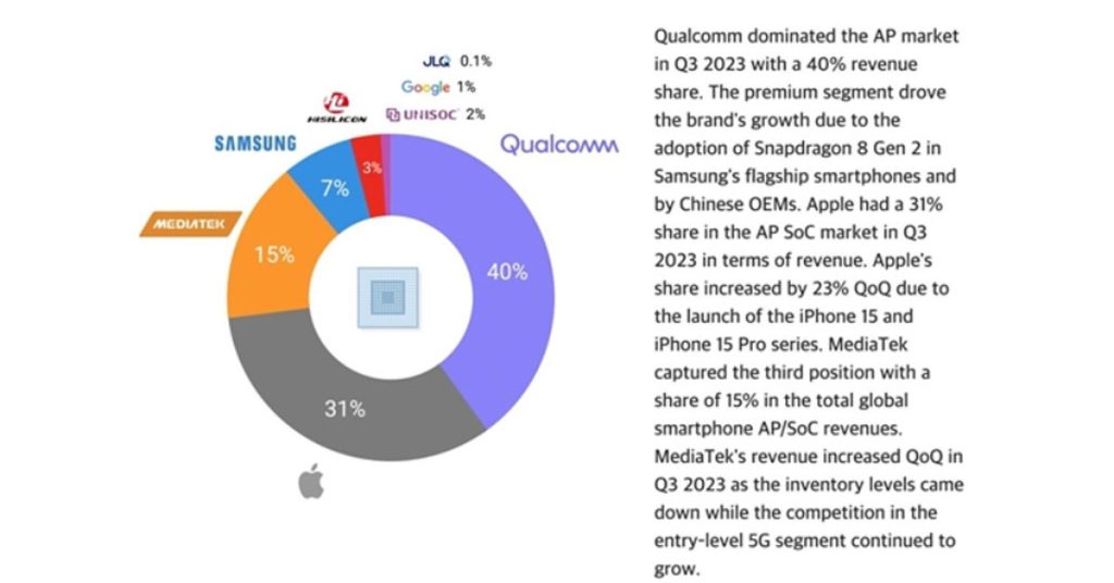 Listenin 1 numarası, yani Dünya’nın en büyük çip üreticisi, herkesin düşündüğü gibi Qualcomm. Şirket geliştirdiği Snapdragon işlemcilerle, %40 gibi devasa bir pazar payına sahip ve uzun süredir de hakimiyetini koruyor. Apple, iPhone 15 serisinin yarattığı etkiyle de beraber yılın üçüncü çeyreğinde, geliştirdiği işlemciler sayesinde %31’lik bir pazar payına ulaşmış.